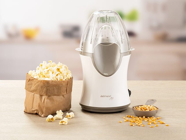Putem să pregătim propriul popcorn delicios de la zero cu Aparatul de făcut Popcorn Delimano Joy. Pur și simplu umplem vasul, apăsăm butonul și vedem cum aerul fierbinte pregătește floricele pufoase fără grăsime și fără remușcări în numai 2 minute; nu este necesar adaosul de ulei. Putere de 1200 W, cupă de măsurare inclusă. Eu fac popcorn la cuptorul cu microunde ambalat în pungi speciale, dar mi se pare mai drăguț acest electrocasnic mic.
