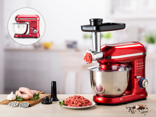 Robotul de bucatarie cu cană de 1.2 litri si vas din plastic de 1.0 litri are 2 viteze și funcție de puls; sistem blocare de siguranță pentru capac și vas; funcții de amestecare, tocare, feliere, marunțire, amestecare aluat, amestecare cu telul; toate accesoriile pot fi spălate în mașina de spălat vase; accesorii: cuțit din inox pentru tocare, ustensilă din plastic pentru frământare, cuțit pentru feliere, cuțit pentru mărunțire, cuțit pentru granulare, disc pentru emulsificare; putere: 500W.