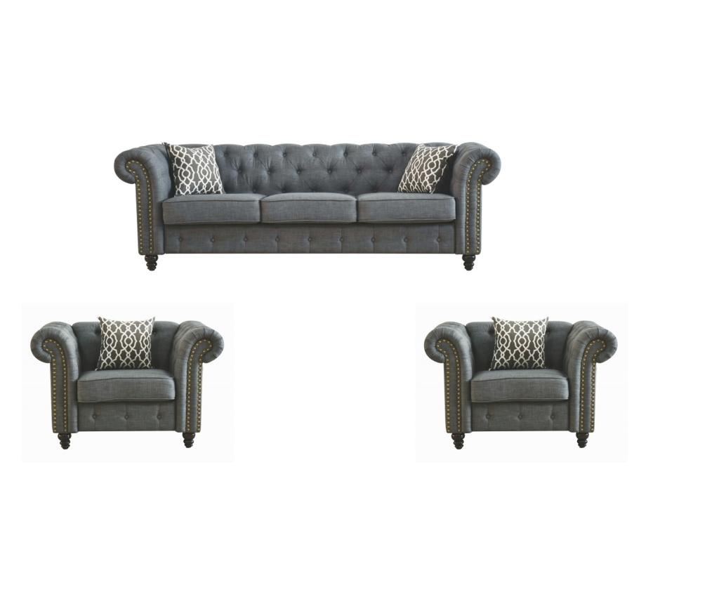 Am selectat setul Chesterfield cu canapea cu trei locuri și două fotolii pentru că are un design clasic și elegant de culoare gri, cu structură din lemn masiv și saltea cu spumă poliuretanică pentru un confort sporit, considerând că este foarte asortat cu mobilierul de sufragerie Tien.