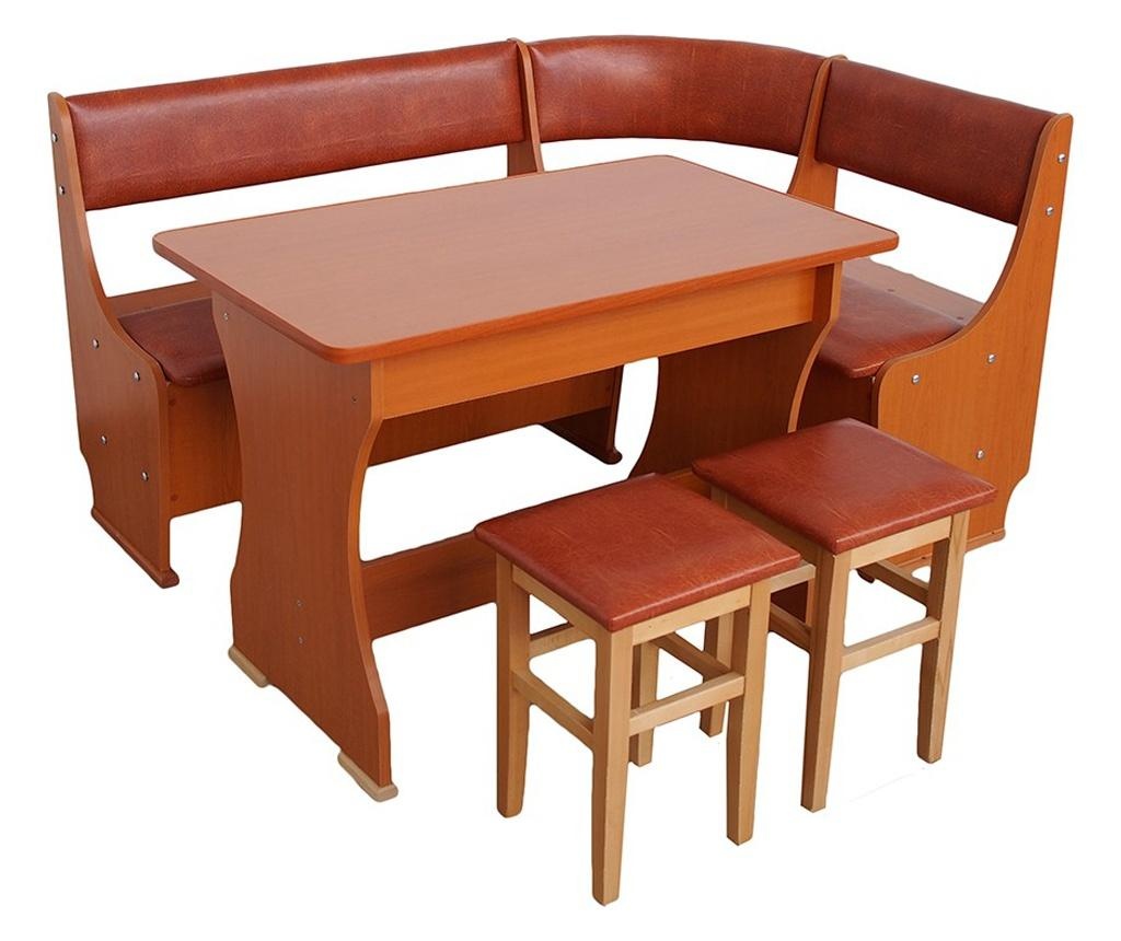 Colțarul de bucătărie Mioara din pal melaminat tapițat cu piele ecologică, cu spații de depozitare suplimentare care se găsesc sub șezuturile banchetelor, cu masă fixă și două taburete tapițate de culoare cireș este suficient pentru o familie. Este frumos, foarte comod, foarte practic, ocupă puțin spațiu, este foarte ușor de întreținut și curățat și o spun din experiență pentru că noi chiar ceva asemănător avem în fosta bucătărie în care mâncăm, recomand.