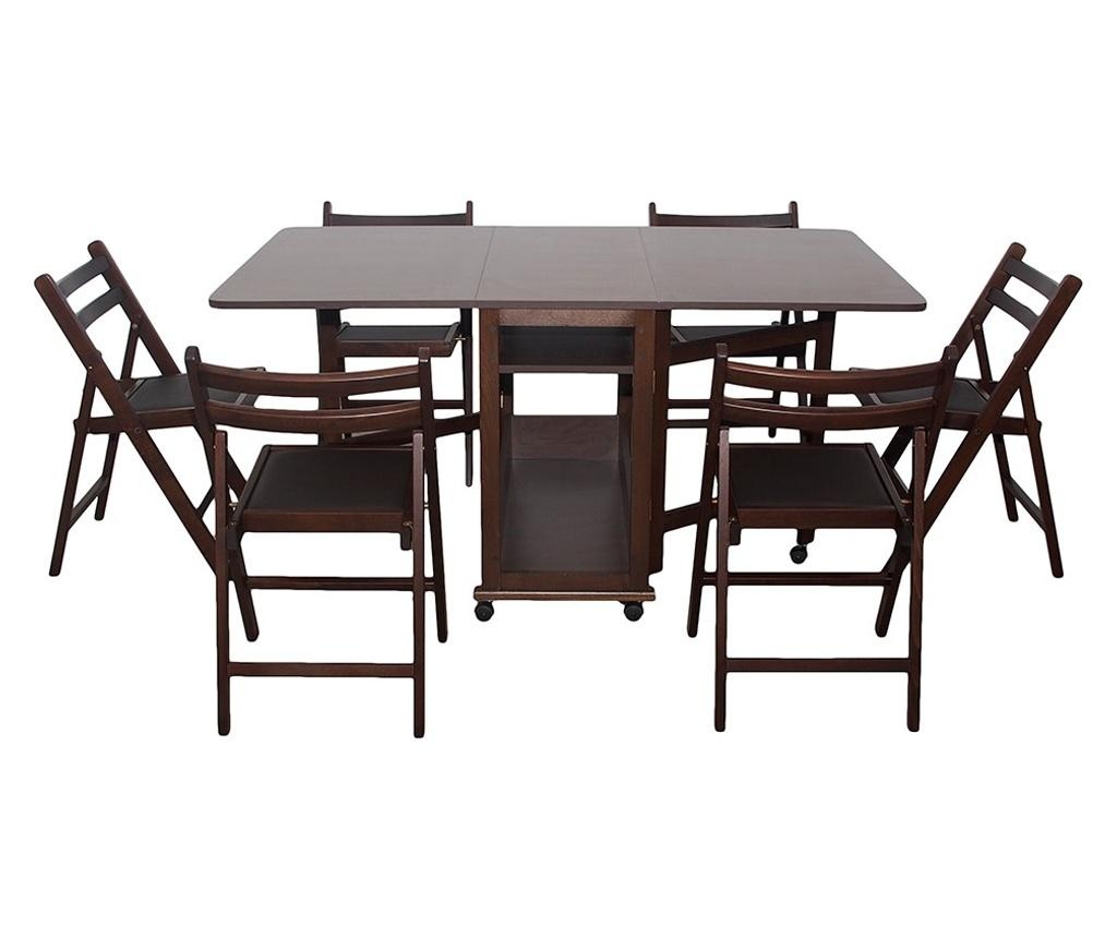Cred că mi-am găsit setul de masă cu scaune ideale care nu ocupă mult spațiu: Set masă pliantă Util cu 6 Scaune pliante, de culoare wenge din lemn masiv cu dimensiunile: lungime 160 cm/lățime 96 cm/înălțime 80 cm. Îți recomand să vezi setul format din șapte piese pe site pentru că pe mine m-a cucerit, votez pentru.