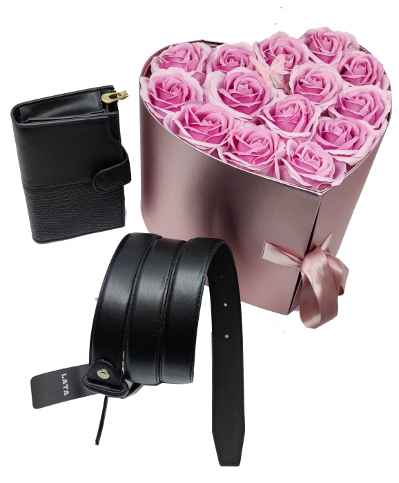 Conținutul pachetului 1 x Aranjament flori săpun + 1 portofel de damă + 1 Curea din piele ecologică