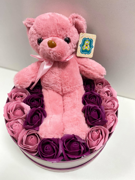 Aranjament floral cu 23 flori din săpun SC-R143-M1 și ursuleț din pluș