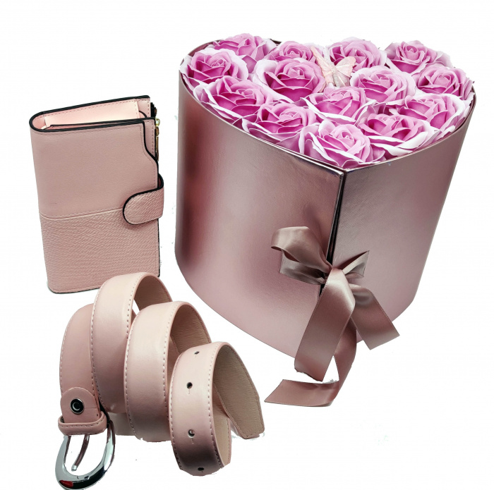 Conținutul pachetului: 1 x Aranjament flori săpun + 1 portofel de damă + 1 Curea din piele ecologică