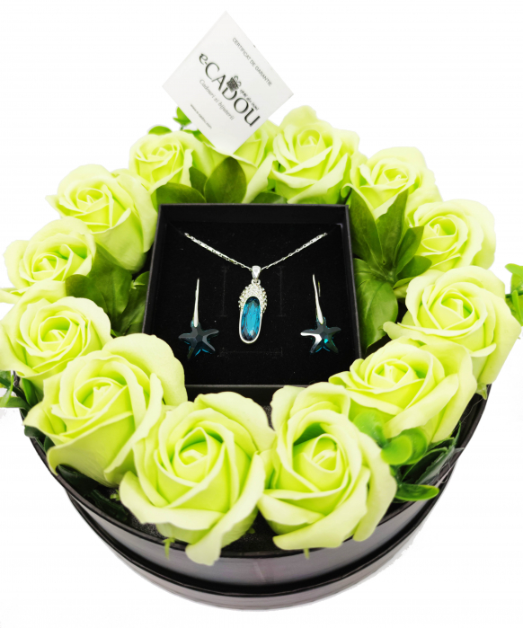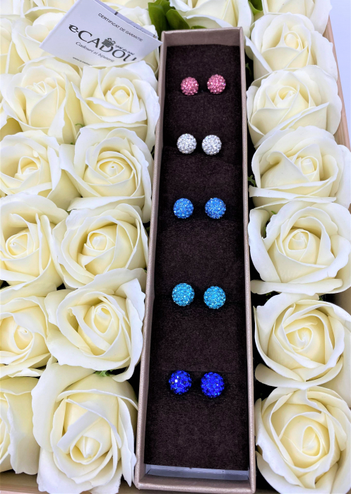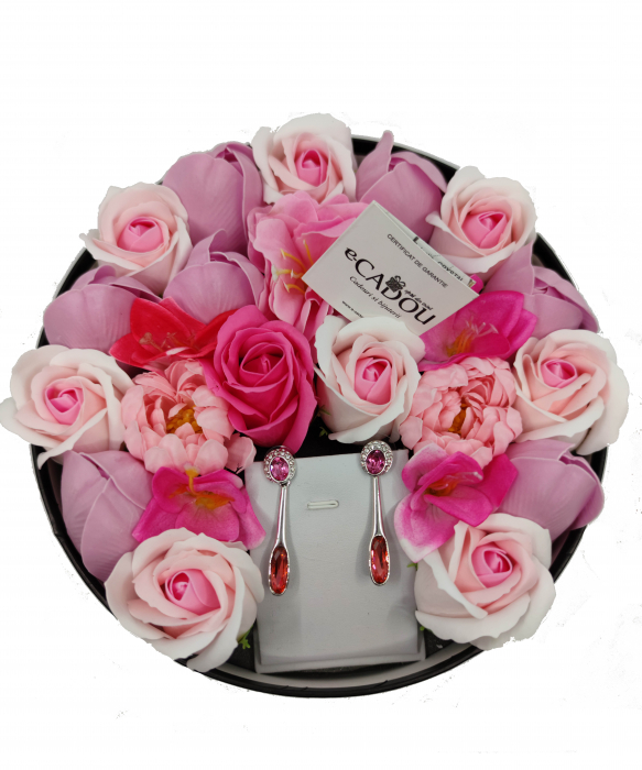 Conținutul pachetului: 1 x Aranjament flori săpun + 1 superb set de cercei cu cristale, placați cu aur 18k; Setul de bijuterii va veni ambalat într-o superbă cutie de bijuterii din imitație de piele cu suport de catifea.