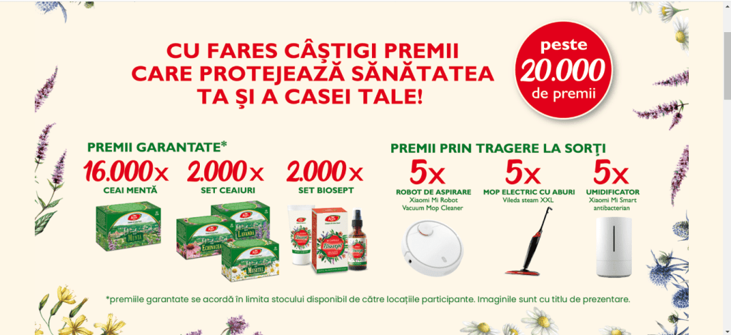 Pentru faptul că îi folosim produsele Fares ne răsplătește cu posibilitatea participării la un concurs aflat în derulare acum, pe care îl poți vedea publicat în acest magazin online, la care pentru participare tot ceea ce trebuie să facem este să cumpărăm din magazinele participante produse Fares în valoare de 50 lei (TVA inclus) și ni se va înmâna un talon răzuibil cu care putem câștiga pe loc unul dintre cele 20.000 de premii garantate; apoi putem să înscriem seria unică a talonului răzuibil în formularul disponibil pe site și prin tragere la sorți putem câștiga unul dintre premiile mari.