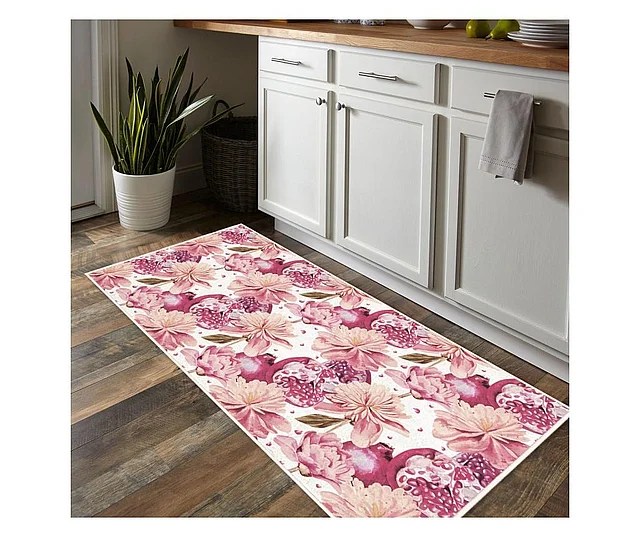 Lățimea unui covor de 58 cm poate părea mică, dar nu este așa pentru spațiul îngust al bucătăriei noastre mutată într-unul dintre balcoane, cu mobilier față în față pe lungime și foarte puțin spațiu între ele. În plus, trebuie să se vadă pe lateralele covorului și gresia superbă, pentru că de aceea am ales-o frumoasă, iar aspectul ar fi exact ca în fotografii.