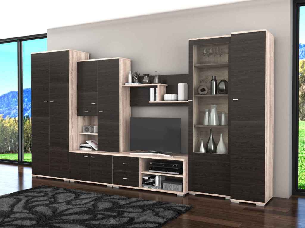 Bibliotecă living Gabriela, wenge + sonoma – Material: PAL grosime 16 mm. Dimensiuni (lățime x înălțime x adâncime) : Dulap: 80 x 201 x 51 cm Vitrină: 80 x 186 x 51 cm; Comodă TV: 110 x 51 x 47 cm; Raft suspendat: 110 x 45 x 25 cm; Vitrină cu sticlă: 60 x 201 x 35 cm; Dulap soldat: 40 x 201 x 51 cm. Preț: 2349 lei.