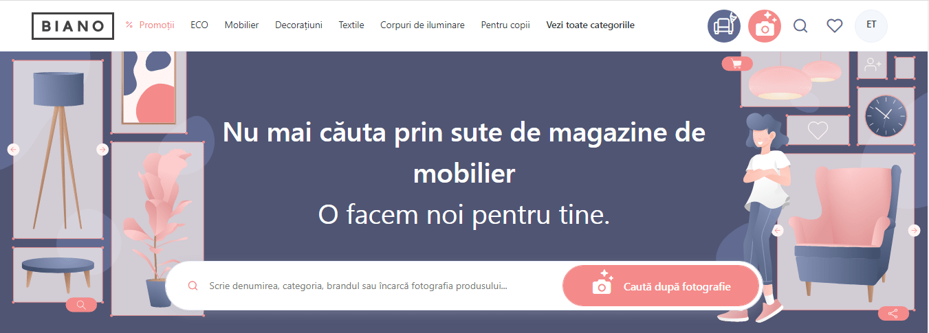 O altă funcție diferită nemaiîntâlnită până în prezent la magazinele online de mobilier și decorațiuni, dar pe care Biano o oferă, este posibilitatea de a încărca o imagine pe site unde vom putea descoperi variante identice ori similare de produs, apoi comparăm prețul, stilul și alegem varianta care ni se potrivește cel mai bine.