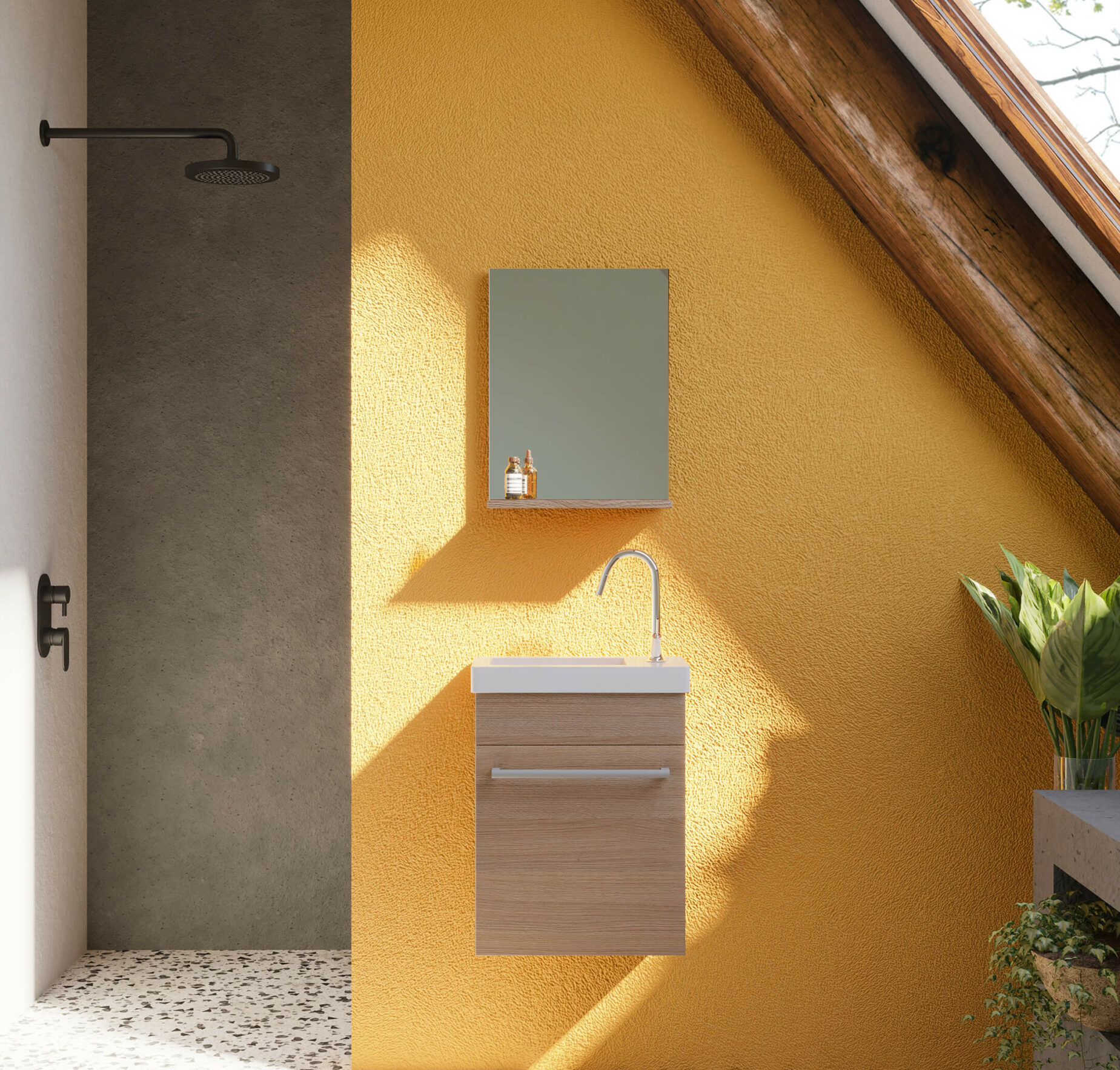 Noi, cei ce locuim în apartamentele cu două camere din blocurile construite în comunism, avem o problemă cu spațiul de dimensiuni reduse al locuințelor în general și al băilor în special care în rare împrejurări depășește 4 metri pătrați. Dacă urmare lucrărilor de amenajări interioare nu am optat pentru cabină de duș, ci am păstrat cada mare pentru a ne bucura de baie la care am pus baterie și suport fix pentru duș înalt, atunci nu mai este prea mult spațiu pentru mobilier.
