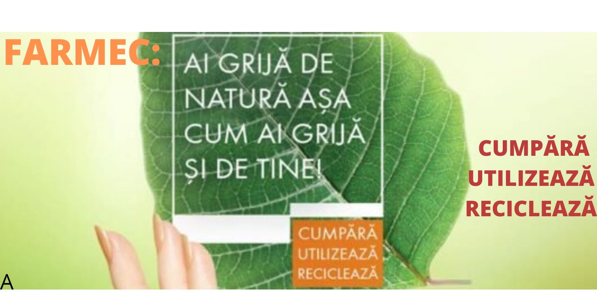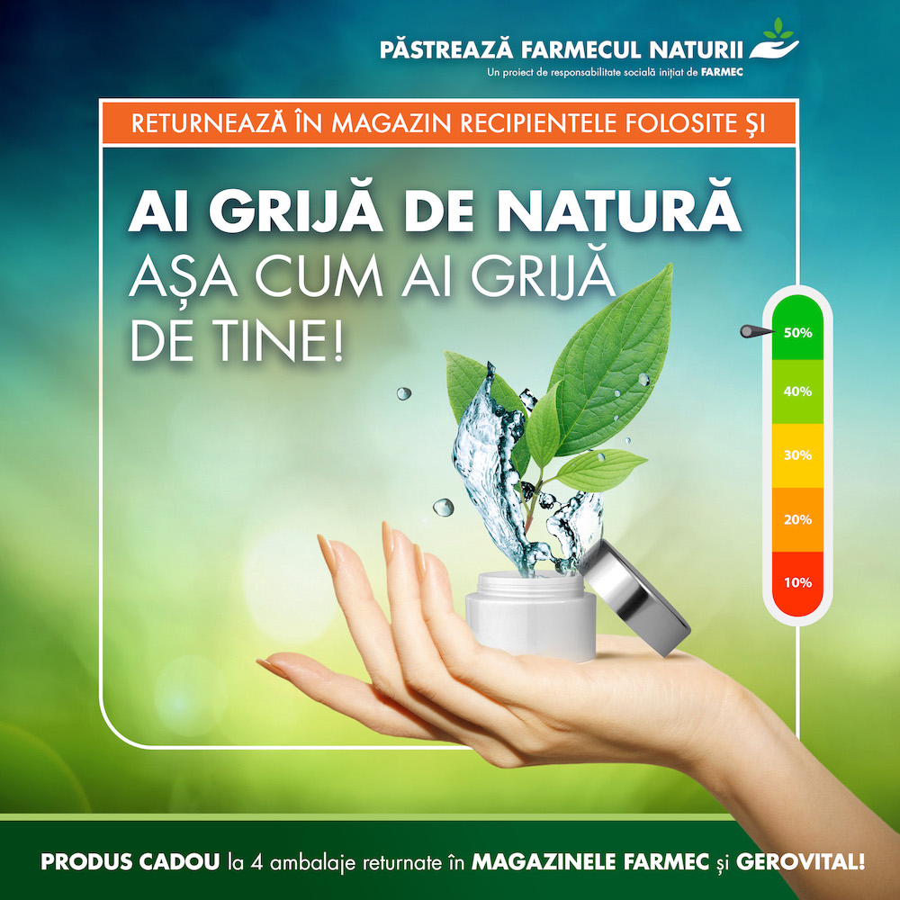 Folosește și tu produse Farmec, Gerovital, Nufăr și Triumf din magazinul online farmec.ro, curăță, clătește și păstrează ambalajele produselor consumate ca să le prezinți în locațiile magazinelor Farmec și Gerovital pentru a beneficia de avantajele campaniei ca la fiecare patru ambalaje reciclate să primești un produs cadou din partea companiei Farmec, pe baza unui cartonaș unde se cumulează câte o ștampilă la fiecare ambalaj returnat.