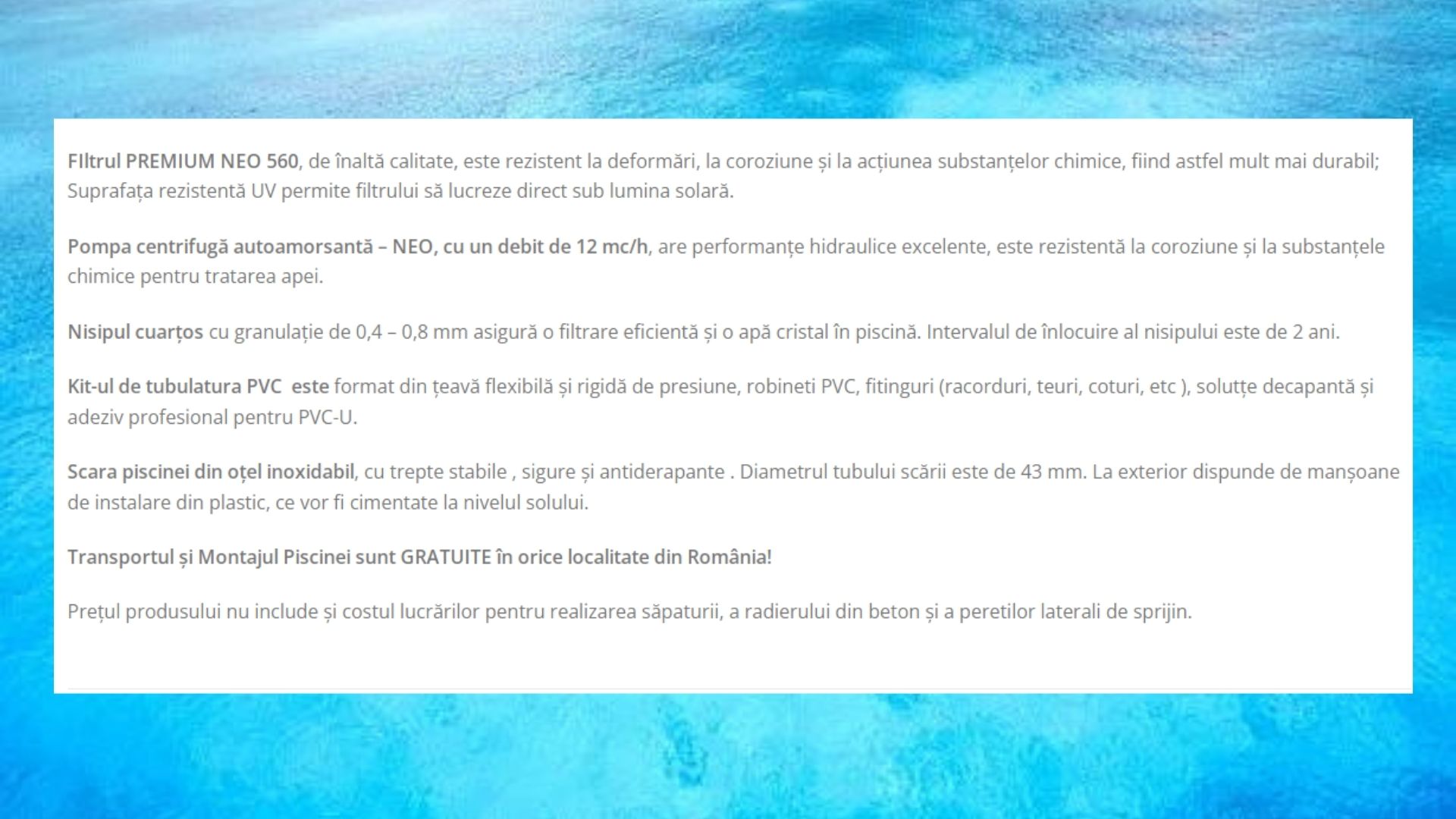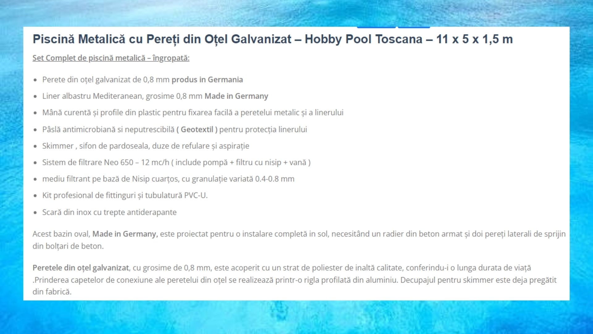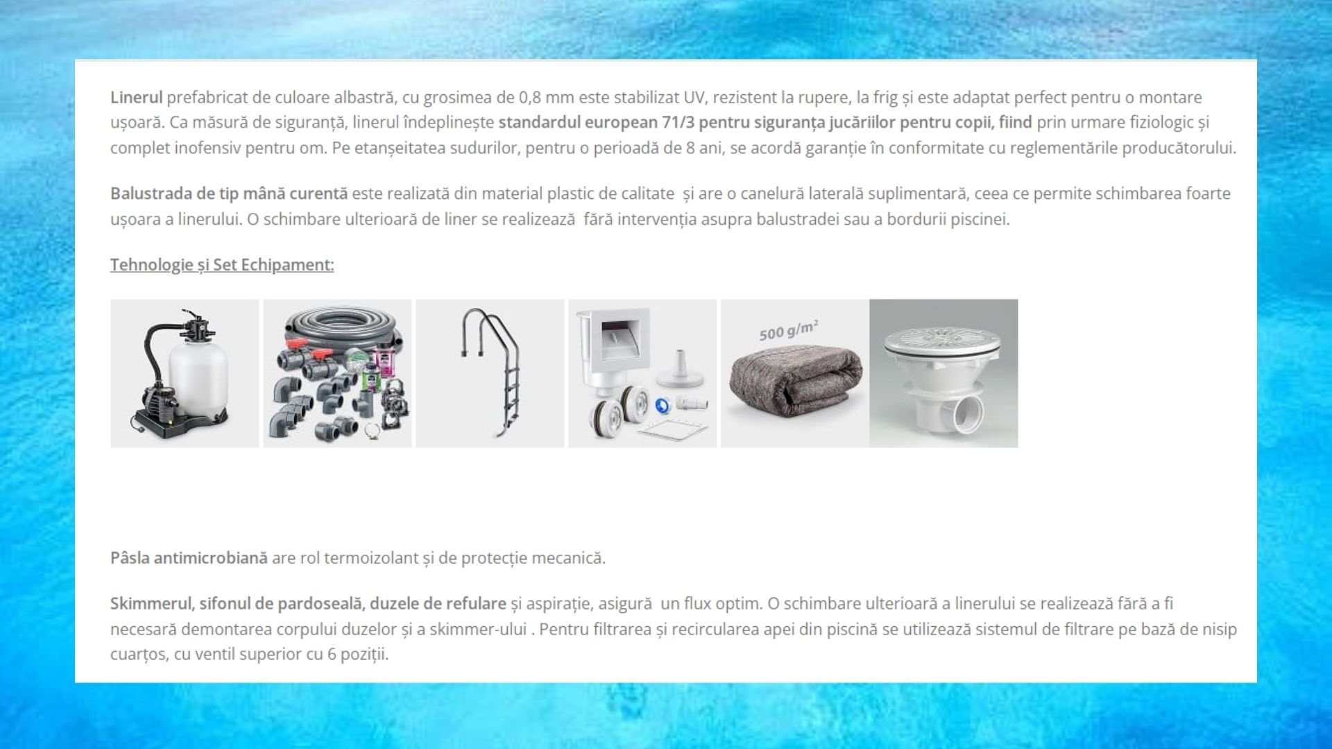 Nu doresc să cădem în plasa “super-ofertelor” astfel încât, după ce am văzut produsele pe care le au în stocurile proprii, prețurile reduse, obiectul de activitate și numărul de peste 500 de clienți din portofoliu m-am hotărât asupra acestei firme cu sediul social în București. I-am ales pentru experiența vastă în construcția piscinelor, prețurile competitive de achiziție și de manoperă și faptul că oferă consultanță permanentă. Practic se ocupă ei de aproape tot ce este mai important de la cumpărare până la construcția efectivă și darea în exploatare.