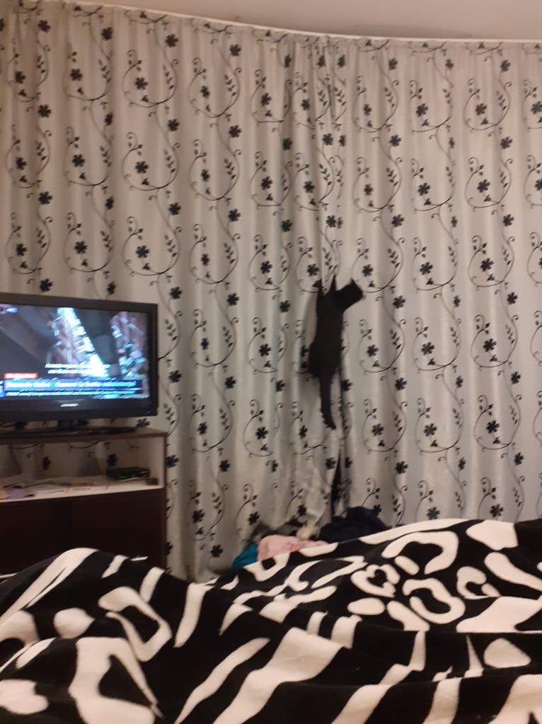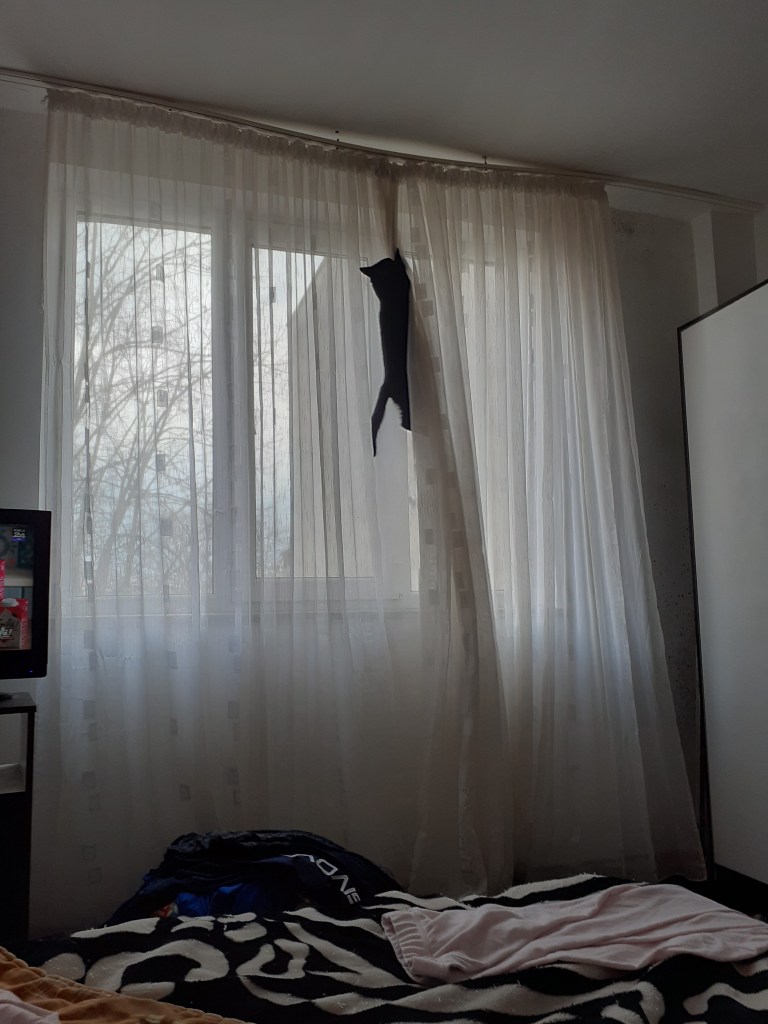Cât timp e mic și nu poate să urce singur pe pervazuri îți va distruge toate perdelele și draperiile cățărându-se pe ele. Normal că nu știe ce face și că nu ar vrea să le strice, însă se comportă așa pentru că vrea să îl pui pe pervaz la geam. Ideal ar fi să tragi perdelele la colțul cel mai accesibil spre pervazuri și să pui obiecte pe care să se poată cățăra, iar mai târziu pe care poate să sară ca să ajungă la geam.