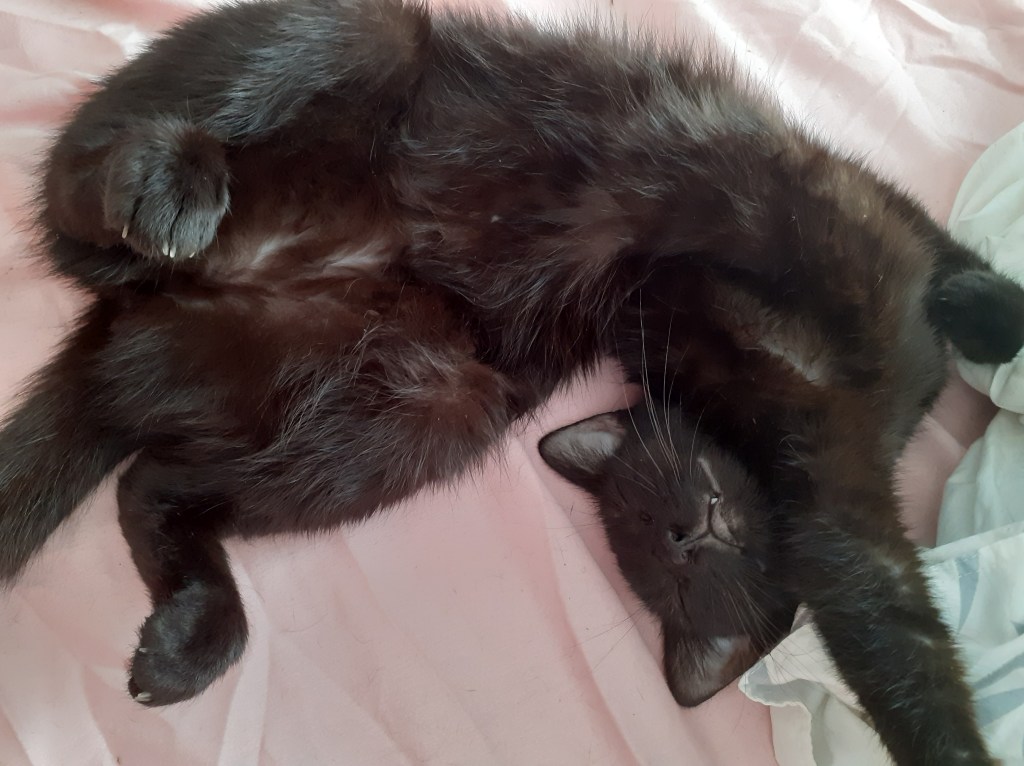 Din primul moment am avut o grijă specială pentru acest pisic pentru că, fiind foarte mic, nu ajungea nici măcar să urce în pat la somnic. Era și arhiplin de pureci, astfel încât a doua zi a trebuit să îl deparazitez fără substanțe dăunătoare, doar cu apă cu șampon special de pisoi, un pieptăn și un prosop alb.