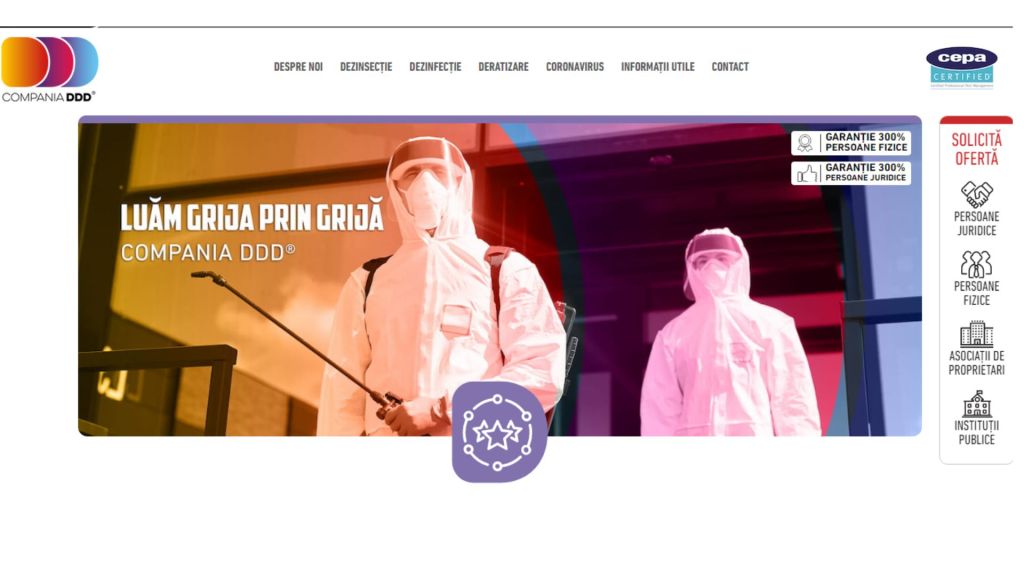 Am găsit o astfel de certificare la Compania DDD®, marcă înregistrată la OSIM, care poate acționa cu echipe de intervenție la nivel național, 24 de ore din 24, pe zonele București – Ilfov, Zona de Vest (Timișoara, Cluj Napoca și Târgu Jiu), Zona de Est (Constanța și Panciu). Serviciile acestei companii se pot accesa printr-o simplă programare în timpul programului de lucru, în oricare dintre zilele lucrătoare, la numerele de telefon afișate pe site-ul companiaddd.ro.