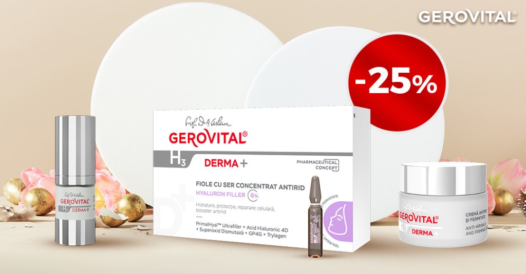 - 25% reducere de prețuri la Dermatocosmeticele Gerovital H3 Derma+ și promoțiile Farmec