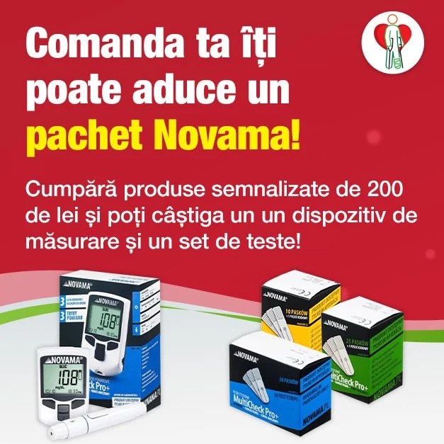 Cumpără produse semnalizate în site, în valoare de minimum 200 lei per comanda, în perioada 1-31 ianuarie 2025, și poți câștiga unul dintre cele 2 Dispozitive 3 în 1 pentru măsurarea nivelului de glucoză, colesterol și acid uric Novama MultiCheck Pro +, împreună cu un test la alegere (în limita stocului disponibil).